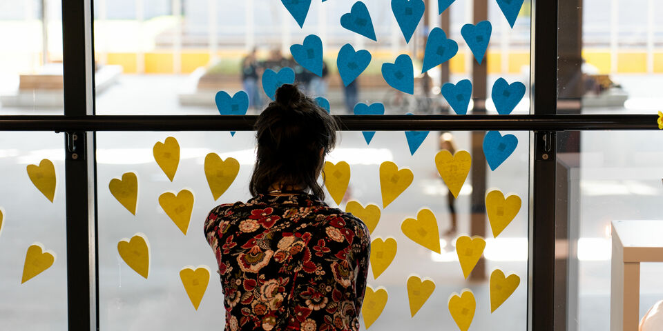 However, for the moment, the room is devoted specifically to the war in Ukraine. Those present at the opening ceremony care deeply about what is taking place. When Van Adel asks them to write down their feelings on small, heart-shaped pieces of paper, they take their time. The large window overlooking the market hall is becoming more and more covered with blue and yellow hearts with messages of fear and hope written on them.