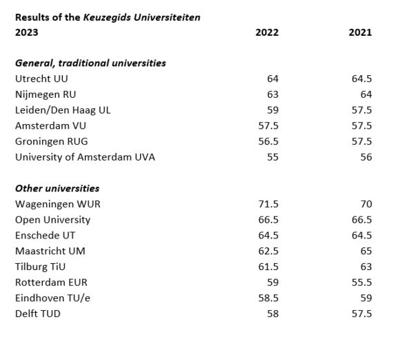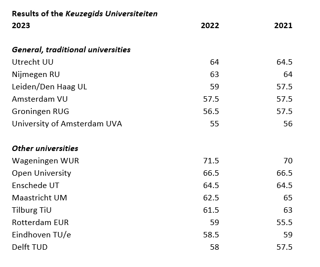 In the category “other universities”, Wageningen has further increased its lead on the Open University. Even though the University of Twente’s score of 64.5 points remained unchanged, it still climbed to third place because Maastricht University’s score decreased with 2.5 points.