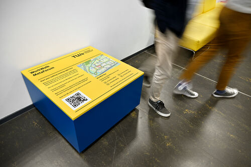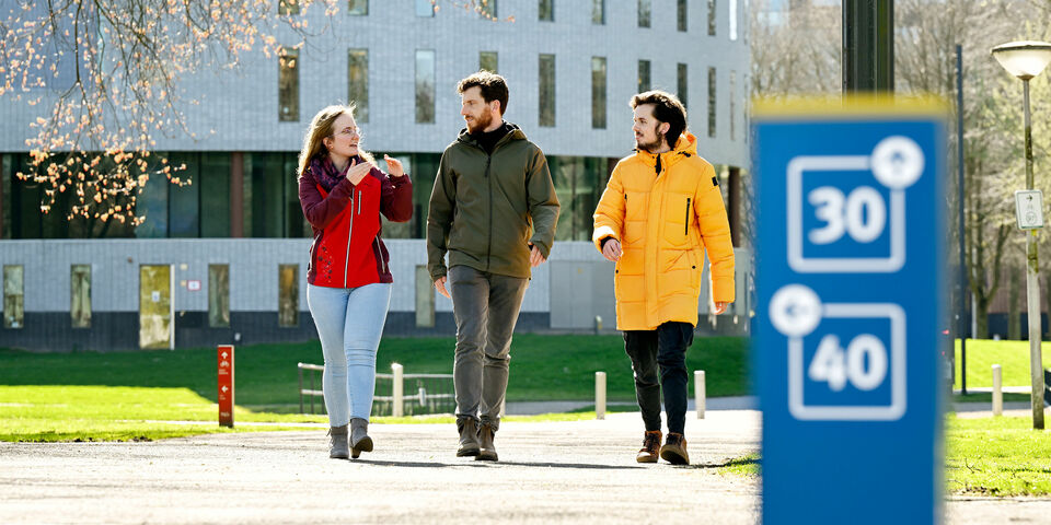 “Shall we walk the 30-minute route?” Erwin Kerkhof (in the middle on the main photo), sustainability advisor at Real Estate, is standing just inside the entrance to Atlas, next to a large blue-and-yellow cube signposting various walking routes on the campus. The cube is new. It is part of the WorkWalk initiative, which provides an alternative to the meeting room. In 2018, during the pilot, employees and students had the chance to hold a meeting or discussion in the fresh air while following a dotted blue lines across the campus. Now the project has been adopted permanently and the blue dots have made way for signposts to routes of ten, twenty, thirty or forty minutes. The seven different starting points can be booked as a ‘meeting room’ in Outlook.