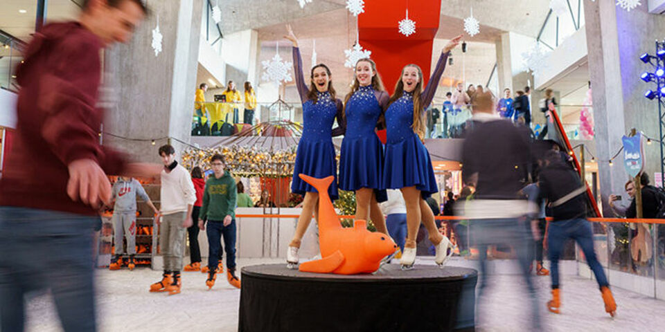 In festive style, with a dance show on the ice and a concert by Vokollage, the WinTU/er Village was opened during today's lunch break. From now through December 20th you can visit the Christmas fair on the ground floor of the Atlas building. There's plenty to see. Christmas trees in every corner, a market square full of picnic tables, stalls selling pea and sausage soup and other winter food and ... an ice rink. The rink is probably the biggest talking point of this year's fair. After all, an indoor ice rink, doesn't that guzzle power?
