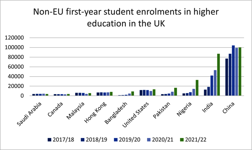 Furthermore, the number of Chinese students enrolled for the first year of an undergraduate or postgraduate course in the UK has been around 100,000 for several years. First-year student enrolments from India have risen sharply from 53,000 to 87,000.