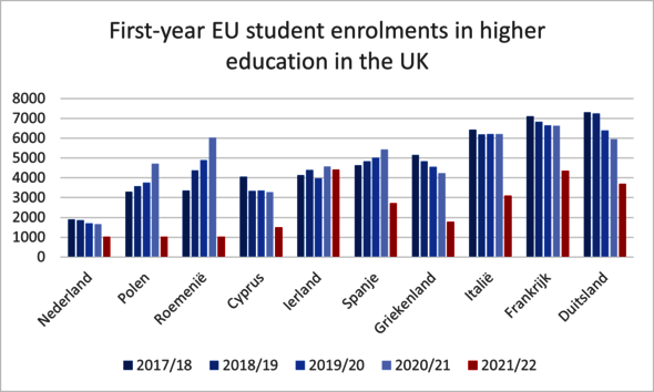In September 2017, 1,900 Dutch students enrolled for the first year of an undergraduate or postgraduate course in the UK. That number eroded, but declined sharply to just one thousand at the start of the 2021/22 academic year, when changes in fees eligibility pushed up the cost of studying in the UK for EU students. They can no longer pay the same home fees as British students, and fees have now risen as high as 38,000 pounds a year, i.e. almost 43,000 euros.