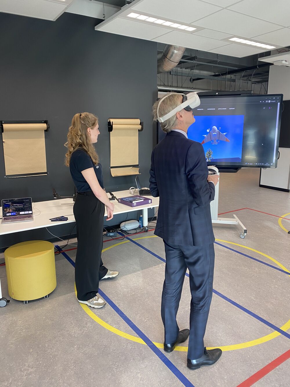 Yesterday, the students of Aero Team Eindhoven presented their project to education minister Robbert Dijkgraaf. During his visit to the TU/e campus, he was given a demonstration of Aero's drone. Dantuma: “Bart Wernaart was also there and told the minister about Moral Design. Afterwards I presented him the rest of the project and he tried the VR goggles (see photo, ed.). The minister also used the option to adjust the drone situation and opted for fewer and smaller drones. He thought it was cool and said 'guys, this is the future'."