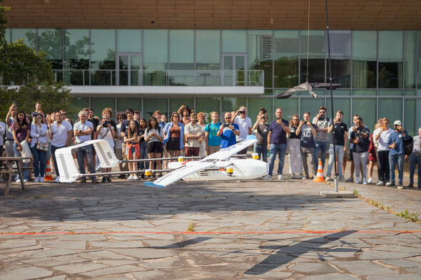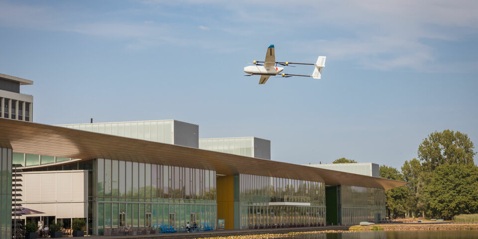 Aero Team Eindhoven yesterday presented the Aegle, a 3D-printed drone with a 3 m wingspan designed with the ultimate aim of delivering parcels to people's homes. This is the student team's first milestone. Under the gaze of the public gathered on the High Tech Campus, Aero put its drone to the test, flying it out over the lake. For three circuits all went well before a gust of wind proved too much of a challenge for one of the four engines.