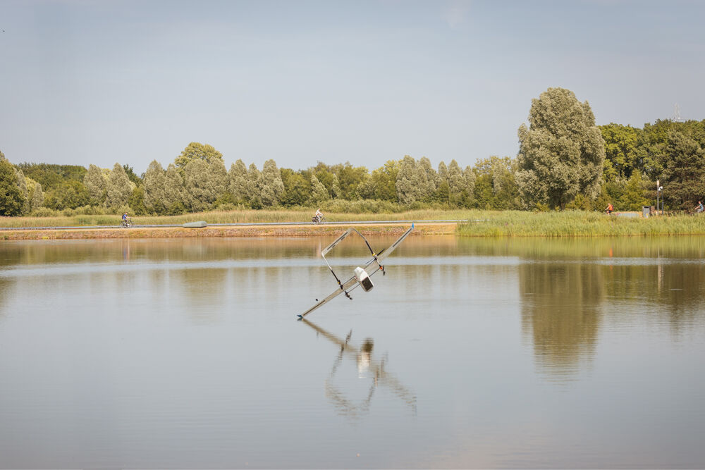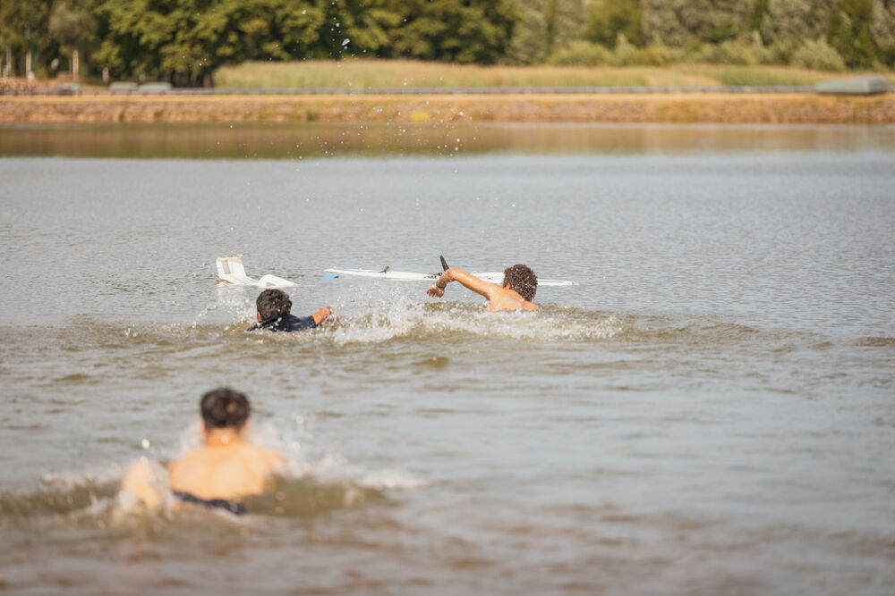 Fifteen minutes later the audience is asked to stand back behind the red line. “Aero is ready for take-off. Stay safe and have fun,” says team member Zach Kohnen. While the weather is sunny, it isn't windless. Aero takes off and guided by the controller, operated by Harsh Nagouda, this impressive behemoth flies serenely out over the lake. Three circuits go well. As Isa Dantuma is saying, “It's nail-biting to watch, but I've got every confidence,” a gust of wind upends the Aegle. It crashes into the water, in the middle of the lake. Without a moment's hesitation, three students dive into the water to retrieve the wreckage. A hush falls over the onlookers.