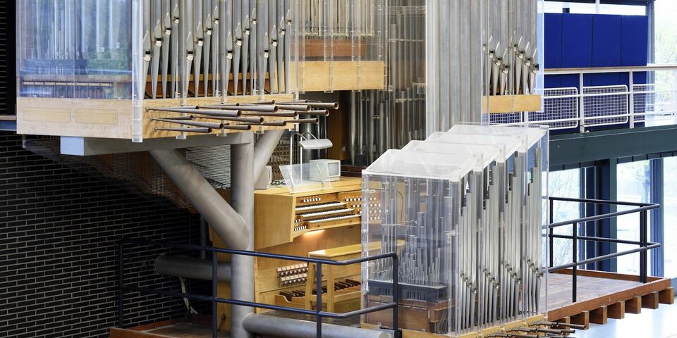 According to Kroesen, the organ, which has been in the Auditorium since 1966, "is pre-eminently an organ that is interesting for engineering students. Through the perspex cabinet behind which the pipes are located, you can see exactly how an organ works. But for sound reproduction, perspex is unfortunately not the most ideal material, wood is much more suitable for that. Because of that perspex casing, the low mids are somewhat lost and the sound is less full." Kroesen thinks that the choice for perspex was made in consultation with the architect at the time. "In this way, the organ was more in line with the modern concrete building in terms of appearance."