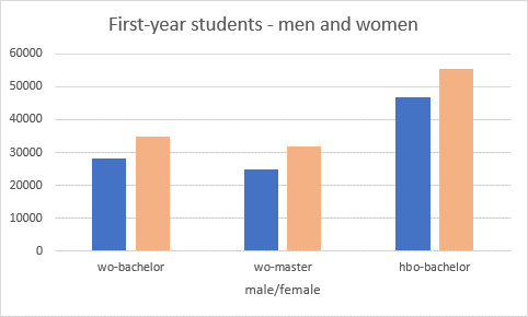At universities of applied sciences, 42% of male Bachelor’s students graduate within five years, compared to no less than 62% of female students. Within years these figures are 61% and 75% respectively.