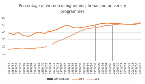 In the past women were less likely than men to enter a degree programme, but ever since 1997 more women than men were registered embarked on higher vocational education programmes, and nine years later the same happened at the universities.