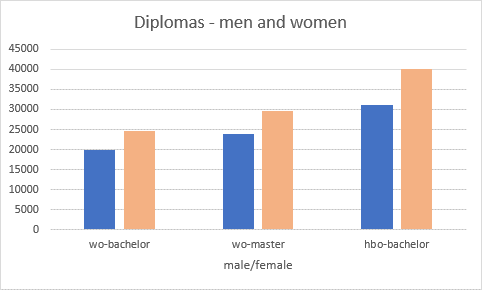 The gender gap gets even wider in education itself. Women complete their studies faster than men; at the universities, 77% of women obtain their Bachelor’s degree within three or four years, compared to only 61% of the men (Dutch universities have not made this information available for Master’s degrees).