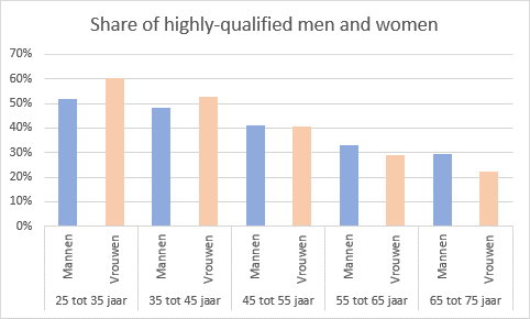 When more women than men pursue a degree and graduate, eventually women are more often highly qualified than men. In the 25-45 age group, women are clearly more likely to possess a degree from a university of applied sciences or university.