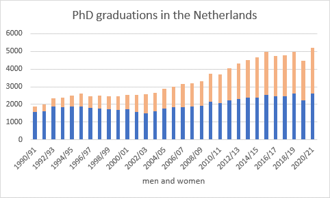 In 2019, a research study by Universities of the Netherlands (UNL) also showed that men and women at Dutch universities were about equally likely to complete their PhD thesis; about three-quarters eventually succeed