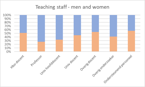 Of a total of almost 3195 university professors, only 858 are women (not counting endowed professors). This is about a quarter. There are no recent figures for lecturers in higher vocational education programmes, but in 2018 31% were women.
