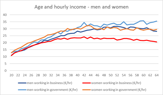 Wage disparities between men and women are decreasing, but women still generally earn less than men. This is particularly evident in the business world, where men start earning substantially more than women from about the age of thirty. In government positions women start with an advantage, but this lead has disappeared by the time they are forty.
