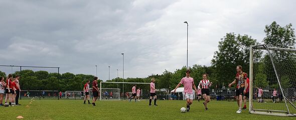 The sun hides behind a layer of clouds, but the grass is dry. Team ‘Zoveel vragen’ faces ‘The Untouchaballs,’ and ‘Groetjes Thuis’ competes against ‘Gewoon degelijke nasi.’ The 5x5 tournament is reminiscent of the Intro. There are groups of students everywhere, some of whom are wearing funny outfits. Very short skirts, tiaras and wings: check. But most students are dressed in soccer shirts. There’s a team dressed in pink Hajraa shirts. “We are very competitive, but we aren’t that well prepared for a soccer event,” the volleyball players say. “Beer is our warming up and we’ll see what happens next.” It turns out to be a successful strategy, because they beat the ‘WijSturenJeInHetBosman’ team 3-0 during the first round, which lasts fifteen minutes.
