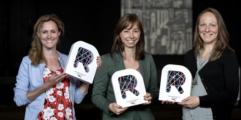 Research supporter Silvie van Dam (left in the main photo), who works at the TU/e Department of Built Environment, has been awarded a prize by SURF for her work. Susan Berentsen of the Hogeschool van Arnhem en Nijmegen (HAN) and Anne Mickan of the Radboud UMC were also awarded for their special contribution to the research of their institution. On Friday 26 May, Cursor will publish an interview with Van Dam.