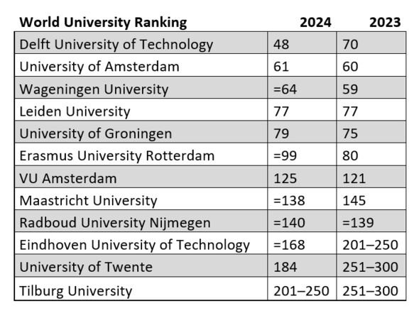 According to the British World University Ranking 2024, eleven Dutch universities are among the best 200 in the world. Only Tilburg University is marginally outside that number.