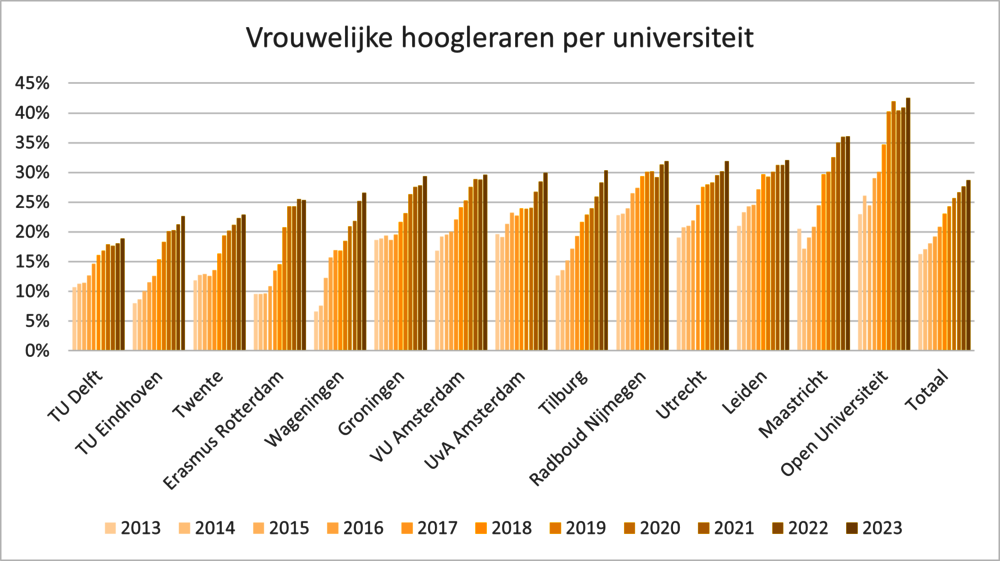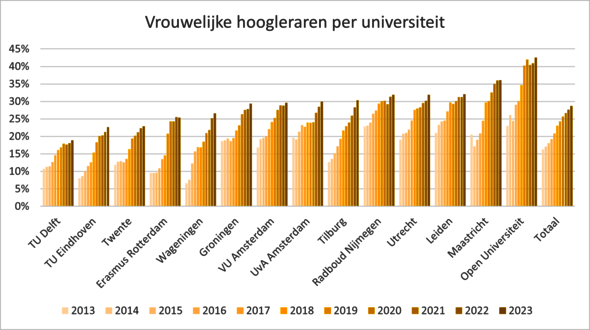 In 2020, the Dutch Network of Women Professors (LNVH) asked universities for their targets for 2025. Four out of fourteen achieved this percentage, says the monitor. They are Erasmus University, Tilburg University, the Open Universiteit and the University of Amsterdam.