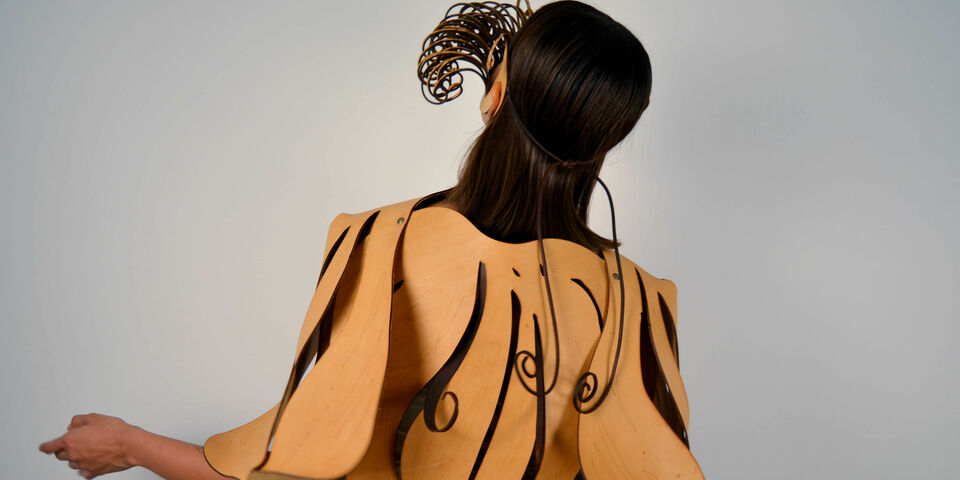 Ioana laser cut her design and refrained from using thread. “To sew leather you need very strong thread which contains plastic. That’s not something I wanted as then it’s not a circular product anymore. Therefore I made this mechanism that ‘hooks’ and therefore doesn’t require thread. The face crown I could mold with water and keep like this purely because it was veg-tanned. By making it wet again, you can model it in any other way you desire."