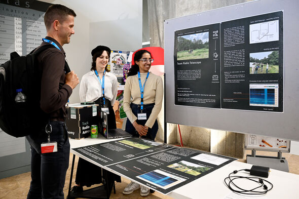 A little farther down the line, student Alicja Urbanczyk (21) was standing in front of a poster showing several photos of a green field, a couple of posts and attached cabling. This is the project she's spent a year working on as a member of the Radio Telescope Team. And that's exactly what they have built. "It was our coach's idea and we were instantly enthusiastic, because it was a great chance to learn about the practical side of radio astronomy." She spoke of a successful project. “We have detected radio signals from the sun, and from Jupiter. The moment those first signals were received will stick in my memory for a good long time."