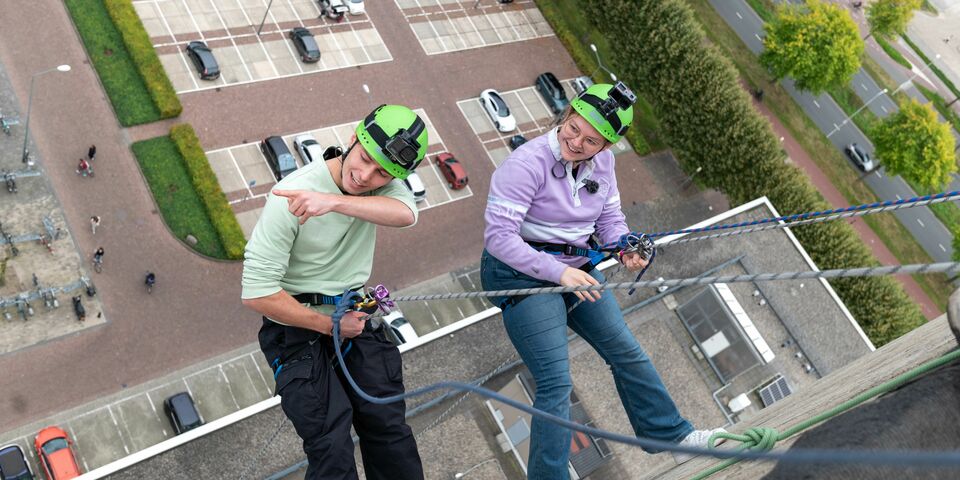 Défi is French for challenge, explains Tessa Verheul, a member of the GEWIS society. Together with Koen van den Berk (see main photo), she organized the rappelling event. “Our goal is to get people out of their comfort zone,” says Verheul. The idea is that by descending Vertigo on a rope, students can face their fear of heights. Challenging yourself is a central focus for the society all year round.