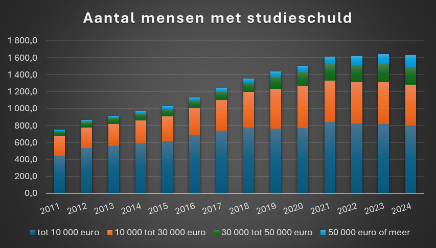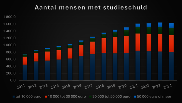 About half of the people with a student debt have a debt under ten thousand euros, while there are also 138 thousand people with student debt over 50 thousand euros. Note that these are the current study debts, including those who have almost finished paying off their debt and after about fifteen years have hardly any debt left.