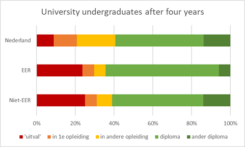 International students drop out more often than Dutch students in later years of the program as well. After four years, a quarter have quit Dutch higher education without a bachelor’s degree, as against 9 percent of Dutch students.