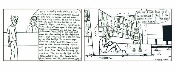 Electrical Engineering student Elles Raaijmakers always tries to see the funny side of things and reproduces this in cartoons and comics. This time: it isn't always easy to find your way on our campus that's being renovated.