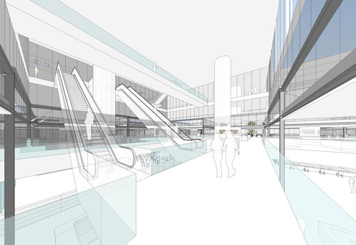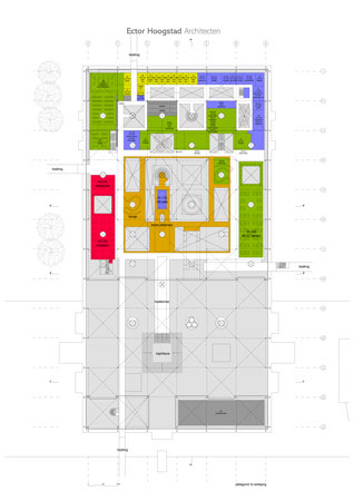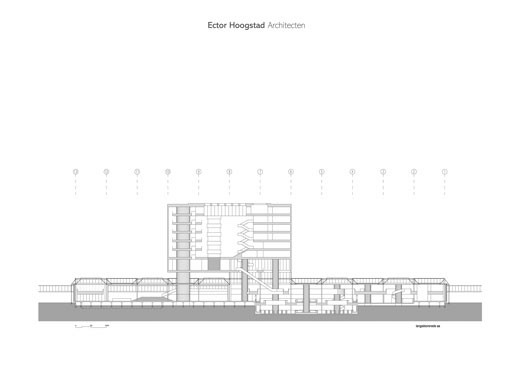 De architect spreekt van een gebouw met dubbele bodem: “We proberen er voor te zorgen dat het gebouw minder hoog aanvoelt dan de zeven lagen die het telt. Dat doen we door op de onderste van die verdiepingen de onderwijsruimten te maken. De bodem van het centrale atrium van het gebouw komt daar bovenop te liggen. Hier ervaar je dus nog maar een hoogte van zes verdiepingen. Lastig uit te leggen: wordt straks in werkelijkheid ook een gevoelskwestie...”