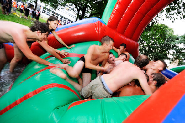 Jo Bonten, zelf in 1980 afgestudeerd bij Elektro aan de TU/e, is matig tevreden over de inzet van de studenten. Hij probeerde ze op te warmen voor hun krachtmeting met de DAF XF 105 truck -zonder oplegger. Die moeten zij 15 meter vooruit trekken aan een touw. Maar daarvoor moet er een stormbaan worden bedwongen. Het opgeblazen plastic zakt onder het gewicht van de introgroepjes in het midden ineen en een aantal mooie blauwe plekken komt tevoorschijn.