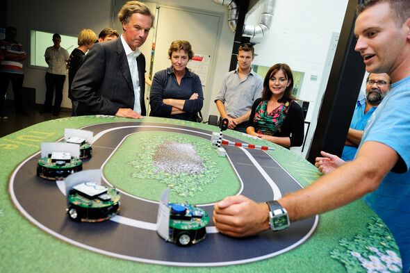 Jolande Sap, lijsttrekker bij GroenLinks, bezocht vandaag de Automotive Campus in Eindhoven en liet zich aan de TU/e informeren over elektrische auto's. Terwijl de cantus even verderop in volle gang was, kreeg ze bij het Automotive Lab uitleg van onder meer prof.dr.ir. Maarten Steinbuch. Aan het eind van haar bezoek maakte ze met de hoogleraar een ritje over de campus.