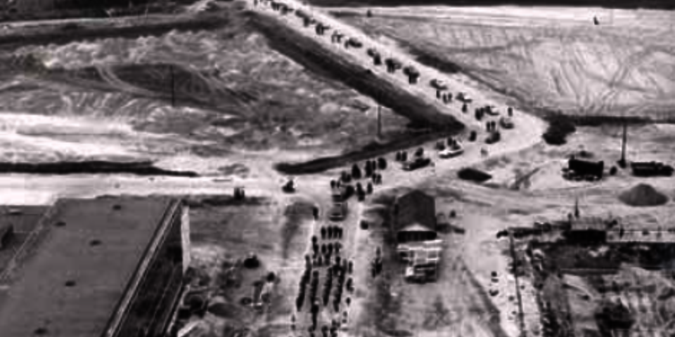 De foto uit 1960 is genomen op de dag van de opening van het academisch jaar. Die dag werd ook de Vestdijktunnel onder het spoor door geopend. Er loopt een fanfare , gevolgd door een stoet auto’s en wandelaars richting Technische Hogeschool Eindhoven.