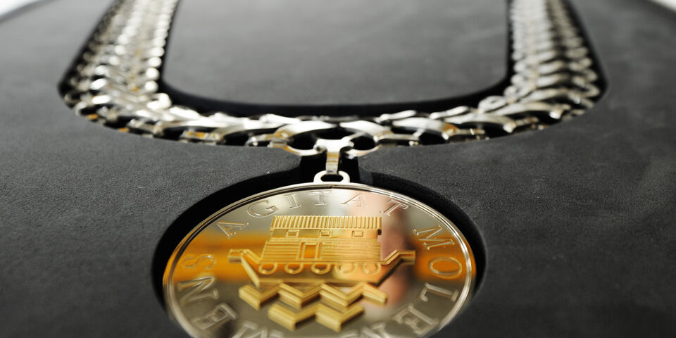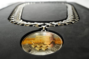 Het originele sierraad, dat wél van zilver is, is in 1957 ontworpen door de Utrechtse zilversmid J.H.M. Noyons en cadeau gedaan door de Technische Hogeschool Delft. In het embleem op de penning staat de tekst 'Mens Agitat Molem' rondom een afbeelding van de ark van Noach op de golven. De ark symboliseert dat de toepassing van de techniek ten goede komt aan het behoud van het menselijk geslacht.