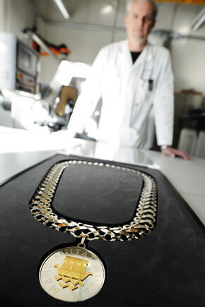 De keten is gemaakt door instrumentenmaker Lucien Cleven van Equipment & Prototype Center van de TU/e. Er zitten 171 arbeidsuren in. “Het is heel ander werk dan de gebruikelijke apparatenbouw voor wetenschappelijk onderzoek. Leuk om tussendoor te doen en het is echt een ding dat gezien mag worden”, zegt Cleven. De keten is gemaakt van ‘nieuw zilver’, net als de vorige replica die ook uit handen van Cleven kwam. “Nieuw zilver is een legering van koper, nikkel en zink. Na het polijsten heeft het materiaal een zilverkleurige uitstraling, maar het is wel veel goedkoper.” Volgens Cleven weegt de keten bijna één kilo.