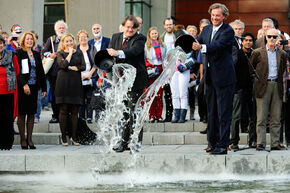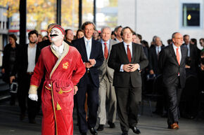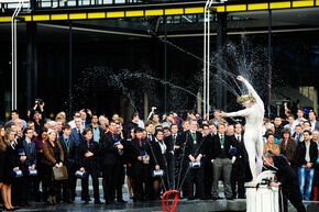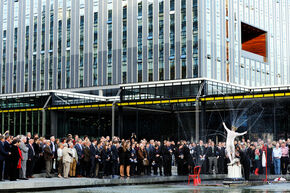 De bijeenkomst werd niet alleen muzikaal opgeluisterd door Orkest Zuid, terwijl geprojecteerde foto’s over de vierkante panelen van het kenmerkende dak van MetaForum schoven - buiten wachtte de toeschouwers ook nog een humoristisch theaterstuk op het water van de vijver, op de bombastische klanken van Ravels ‘Bolero’.