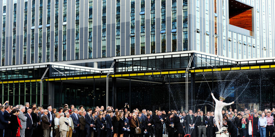 De donkerblauwe TU/e-fleecedekens voor alle aanwezigen bleken vanmiddag bij de officiële opening van MetaForum niet helemaal op hun plek. De onverwachts warme oktoberdag vormde dan ook het grootst mogelijke contrast met 1 december 2010, toen de nieuwbouw feestelijk maar krakend van de kou van start ging.