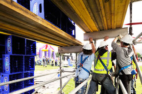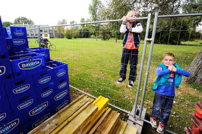 Het werk wordt achter dranghekken bekeken door een uitdijend publiek. En tal van cameraploegen. "Gisteren hadden we ruim 17.000 bezoekers op facebook", vertelt Joep Rutgers, een van de bouwers. Waarmee sponsor Bavaria op haar wenken wordt bediend.