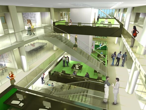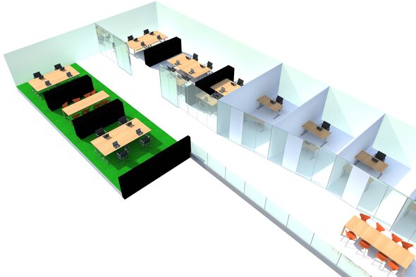 Driedimensionale studie naar mogelijke werkplekindeling. Het College van Bestuur heeft de ontwerpers opgedragen de indeling 'flexibel en toekomstbestendig' te ontwerpen.