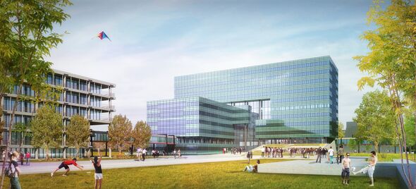 De artist's impression van Project 2, gezien vanuit de richting van TNO; het gebouw links is Gemini. Op de voorgrond de Groene Loper, waardoor het nieuwe ontwerp naadloos past in het plan Campus 2020.