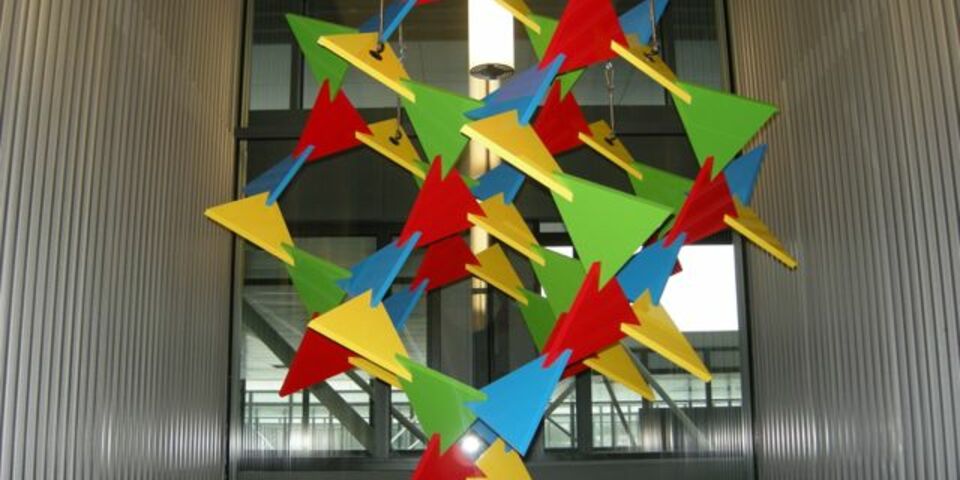 De grijze wachtruimte bij de liften op de eerste verdieping in MetaForum ziet er sinds dit weekend een stuk kleuriger uit. Zaterdag is er het kunstwerk Bamboozle opgehangen dat dr.ir. Tom Verhoeff samen met zijn vader en wiskunstenaar Koos Verhoeff ontwierp. Samen bouwden ze een unieke ruimtelijke structuur.