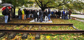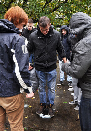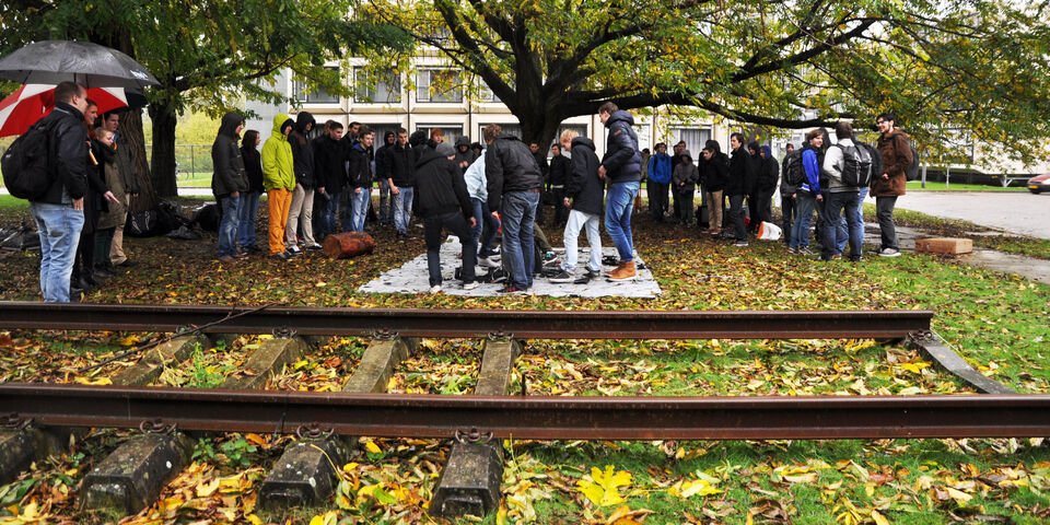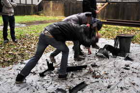 De opkomst is, ondanks het slechte weer, groot: acht teams van elk vier tot zes personen doen er mee. Vooral team 5 is bruut en luidruchtig. Niet dat het tentamen van die ochtend nou zo slecht ging, hoor: “Ik heb sowieso nooit zo’n last van opgekropte frustraties”, verzekert Koen Elands, die even daarvoor als een malle in touw was met een grote bijl, met koele blik. “Ik ben gewoon fanatiek met slopen, het gaat om het feit dat je iets kapot mag maken.” Een tactiek of zorgvuldig uitgekiende strategie had zijn fanatieke team niet: “Gewoon rámmen. Alles kann kaputt”.