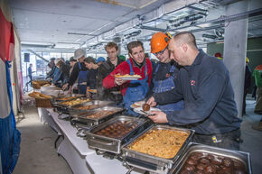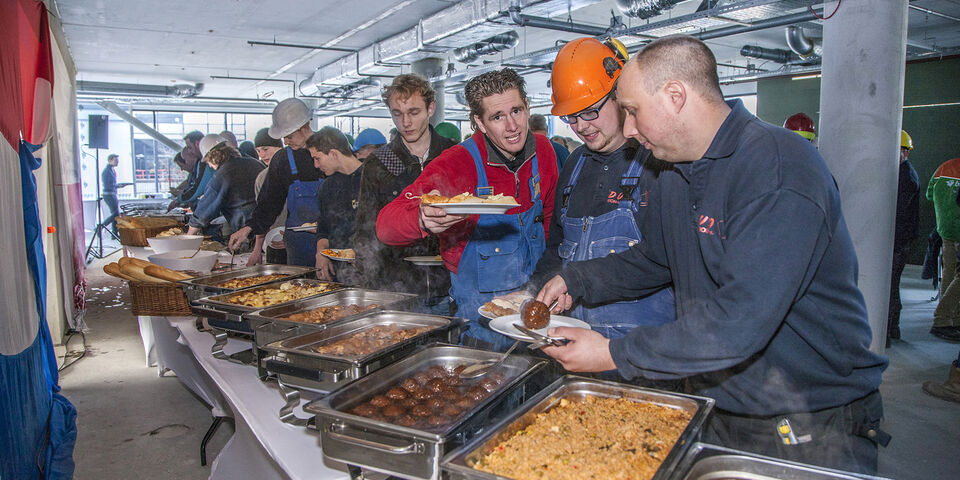 Nadat de aanwezigen het champagneglas hebben geheven, laten vooral de bouwvakkers zich het lunchbuffet goed smaken. Vanachter hun borden gevuld met nasi en gehaktballen vertellen sprinkler monteurs Tom Schuiling en Leandro Fa niet meer op te kijken van het bereiken van een hoogste punt. “Maar dat het op zo’n manier gevierd wordt, komt steeds minder voor. Dus dit is echt wel top.”