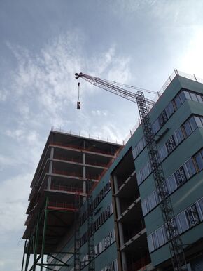 Van Ham bracht verder een toast uit op het aanwezige personeel van BAM Utiliteitsbouw. De werklui blijken weken voor te liggen op schema. Dat is volgens uitvoerder Martijn van den Hoef en projectorganisator Ad Janssen voor een groot deel te danken aan de zachte winter. “Normaal calculeren we een aantal vorstdagen in, maar dat was dit jaar niet nodig.” Daarnaast verloopt de ‘ruwbouw’ sneller dan verwacht. “We hebben van tevoren vijftien werkdagen per verdieping begroot, maar in de praktijk hebben we er maar dertien nodig.” Inmiddels is een begin gemaakt met het plaatsen van de binnenwanden en de vloerafwerking. Hoewel de geplande opleverdatum van het gebouw december is, wordt dat misschien wel een maand vroeger, aldus Van den Hoef.