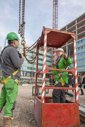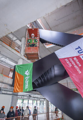 Met champagne, gehaktballen en een ‘bungelend’ CvB-lid is deze middag het bereiken van het hoogste punt van gebouw Flux gevierd. Eigenlijk werd het hoogste punt van de nieuwbouw voor de faculteiten Electrical Engineering en Technische Natuurkunde vorige week al gerealiseerd, maar het officiële feestje vond vandaag plaats. Flux is zo’n veertig meter hoog.