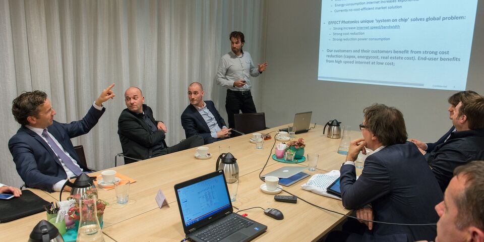 Boudewijn Docter, in 2009 gepromoveerd aan de TU/e en CTO van het op Strijp-S gevestigde Effect Photonics, legt in Catalyst in simpele termen aan Dijsselbloem en zijn entourage uit wat het product van zijn bedrijf precies behelst. Burgemeester Rob van Gijzel en collegevoorzitter Jan Mengelers luisteren ook aandachtig toe.