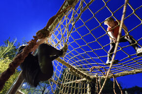 Bij de apenhang kruip je hangend aan een touw. Als je armen daar te verzuurd van raken, zwaai of rol je boven op dat touw. “Dat vergt een stukje techniek”, zegt Tim, “maar dan heb je een mooie cat crawl gedaan.”
