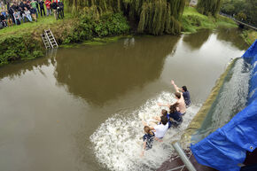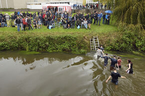 Inmiddels staat groepje 27 klaar. Ze hebben allemaal een snorkel op en Kevin Looman heeft zelfs een zwembandje om zijn arm dat hij nog bewaard heeft uit zijn introtijd toen het de gadget van zijn introgroepje was. Maar bang om te verdrinken hoeven hij en zijn teamgenoten niet te zijn; het water in de Dommel komt niet hoger dan hun heupen.