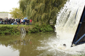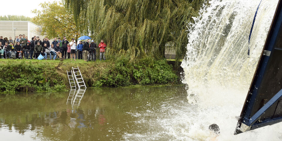 De eerstejaarsstudenten Werktuigbouwkunde zijn vandaag dubbel en dwars gedoopt door studievereniging Simon Stevin. Zoals ieder jaar kreeg hun zelfgemaakte constructie een wiptest. Die wip hangt boven de Dommel en in ieder geval belanden de studenten in het water. Het is een symbolische doop, “want in de Dommel, daar stroomt ons bloed”, zeggen Simon Stevinleden. Weer of geen weer.