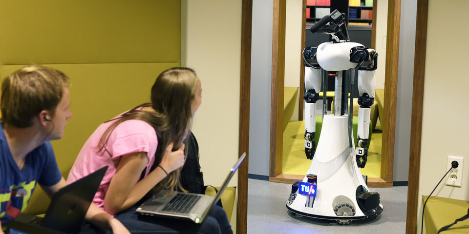 Het lukt aardig, studenten voelen zich niet gestoord. “Ik hoor hem wel, maar op vloer 0 is het nooit volledig stil”, zegt Nils Fleuren, die een huiswerkopdracht voor zijn derde jaar Technische Natuurkunde maakt. Eerstejaarsstudent Software Science Ruben Brekelmans vindt het helemaal prachtig. “Ik ken de robot al vanaf het WK Robocup. Leuk om hem hier in actie te zien.”