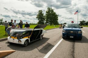 Een heel karwei is het om een auto die én een Nederlands nummerbord draagt, én maar een maand in het land zal zijn, én zelfgebouwd is, in de Verenigde Staten op de weg te mogen laten rondrijden. Maar het Solar Team Eindhoven (STE) heeft het bijna voor elkaar; het laatste document is gisteren getekend door de Michigan State Police.