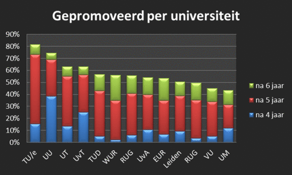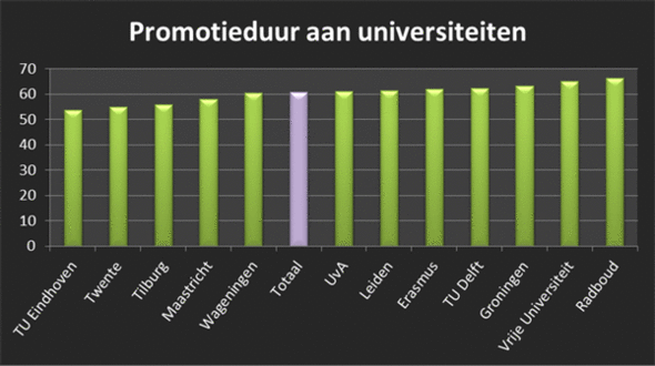 Promovendi van de TU/e doen het kortst over hun promotieonderzoek. Dat blijkt uit cijfers van de VSNU. De gemiddelde Eindhovense promovendus rondt zijn promotie in 54 maanden af, terwijl daar 48 maanden (vier jaar) voor staat. Na vijf jaar is ruim zeventig procent klaar - ook daarmee is de TU/e koploper binnen Nederland. Naar schatting haalt landelijk één op de drie promovendi de eindstreep überhaupt niet.